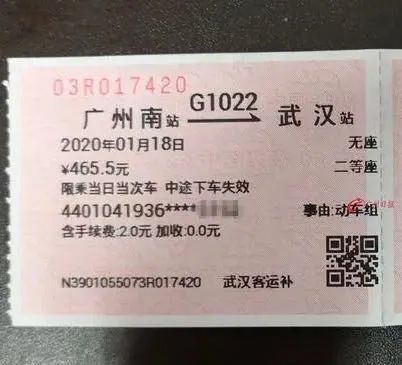 这是一张动车票,出发时间为1月18日,起点和终点分别是广州南站、武汉站。二等座,票价465.5元。除此之外,它还传递着两个更重要的信息:无座、补票;身份证号显示1936,乘车人已经84岁高龄?