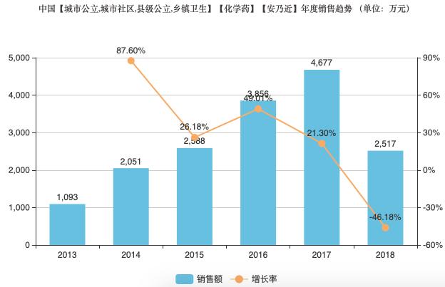 在米内网数据库查询安乃近历年来市场数据发现,其在2013年的市场规模只有1093万元,但是在2017年达到4677万元,市场规模一直在扩大。直到2018年市场规模才开始下降,降至2517万元。
