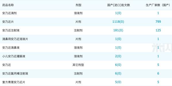 其中,安乃近片的批文数量最多,达到1118条,涉及的生产企业多达799家;其次是安乃近注射液,批文数量达到181条,涉及生产企业达到125家。