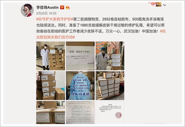 李佳琦也没落下,1月24日,他的团队购买了9000套医用防护服、4万只N95口罩、7000只一次性医用口罩,寄往武汉红十字会以及武汉当地医院。