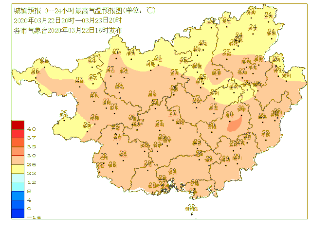 由于冷空气势力弱,气温受此影响比较小,只有一丢丢的下降,全区暖和湿润,最高气温仍维持在28℃左右。