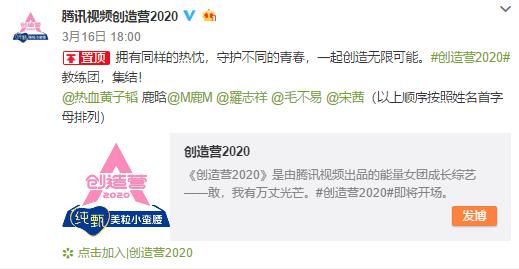 而腾讯视频《创造营2020》应战的教练团话题度也不遑多让:除了专业能力突出的毛不易、罗志祥外,其他三位教练黄子韬、鹿晗、宋茜都曾经出自同一家公司——曾培养出知名偶像团体东方神起、少女时代等的韩国大型娱乐公司S.M.Entertainment。这种“前同事关系”让节目本身具有了一定话题度,以至于《创造营2020》教练团全部官宣之后,有网友评价:“创3的导师阵容堪称SM部门审核。”