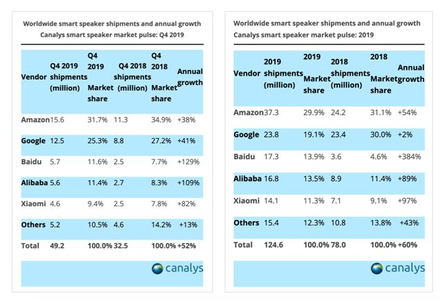 与用户接纳度快速提升相对应的是,智能音箱出货量在逐年增长。Canalys数据显示,2019年第四季度全球智能音箱出货量为4920万台同比增长52%。其中,小度以384%的惊人增长率,创下全年出货量1730万台的战绩,稳居国内第一、全球第三。另一家市场调研机构Strategy Analytics最新报告也表示,2019年小度以绝对优势连续四个季度拿到中国市场出货大满贯,成为中国智能音箱行业当之无愧的王者。