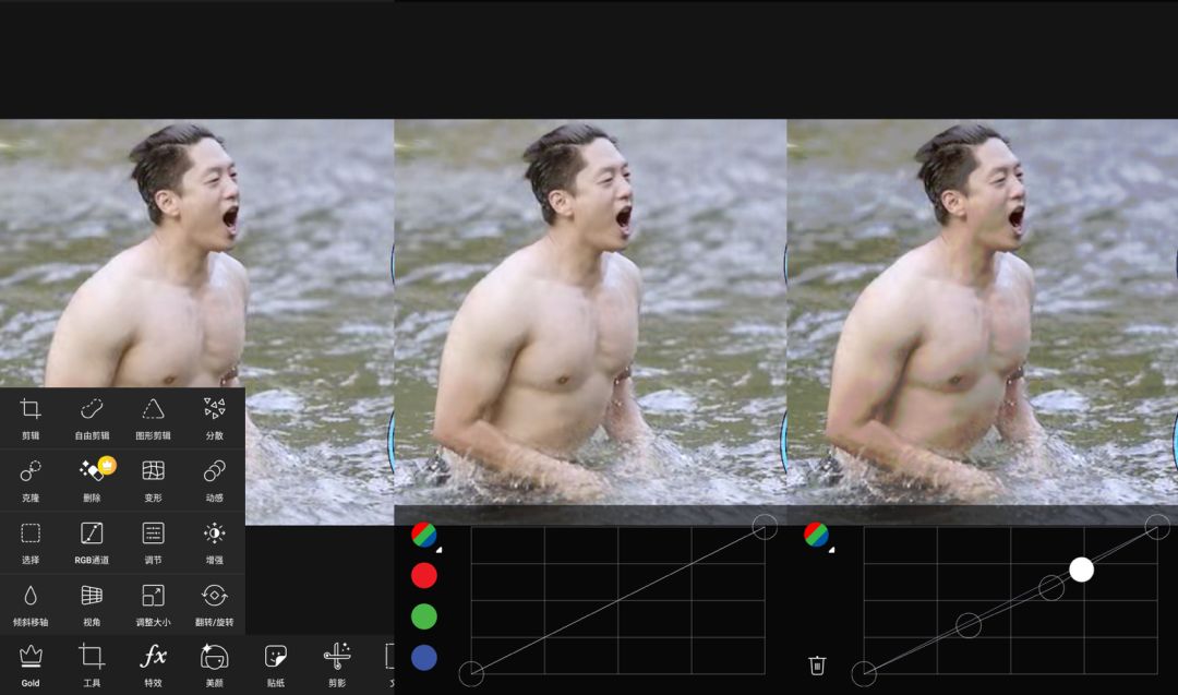 以主打专业修图的Piscart美易为例,包括特效、美颜、镜头光晕等十多项功能。工具栏里包含RGB通道、视角、变形、倾斜移轴等,能够对原图的色彩、构图进行修整。不同于美图秀秀、轻颜等固定参数下的调色美化,Piscart美易的手动调整能够避免细节丢失,美白、调亮的效果更细腻真实。