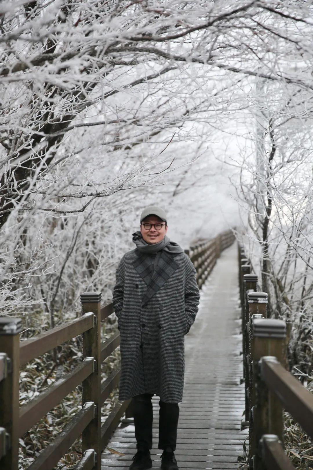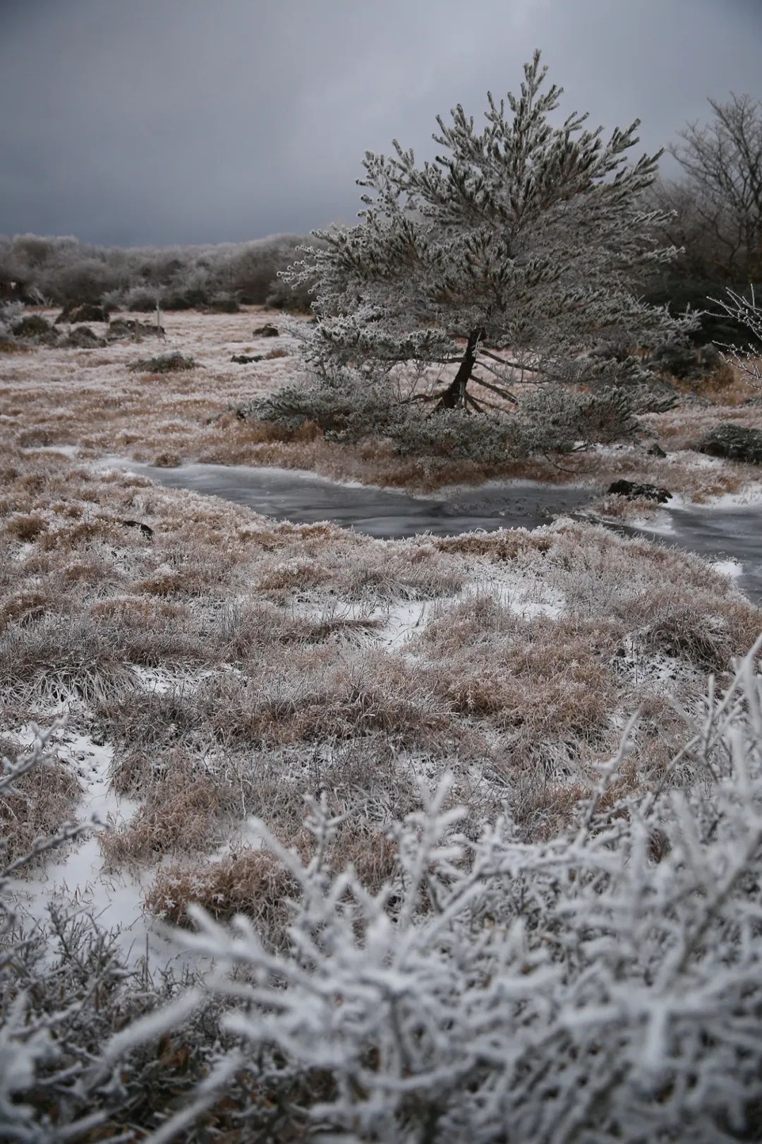 上山前我问向导,1100湿地是否可以看得到夕阳,他笑而不答,那时山下的阳光正无比的耀眼。我知道他是想给我们一个惊喜,仅仅二十分钟的车程,山里已是乌云压顶,小雪渐起,抵达停车场时眼前已是一派冰雪世界。