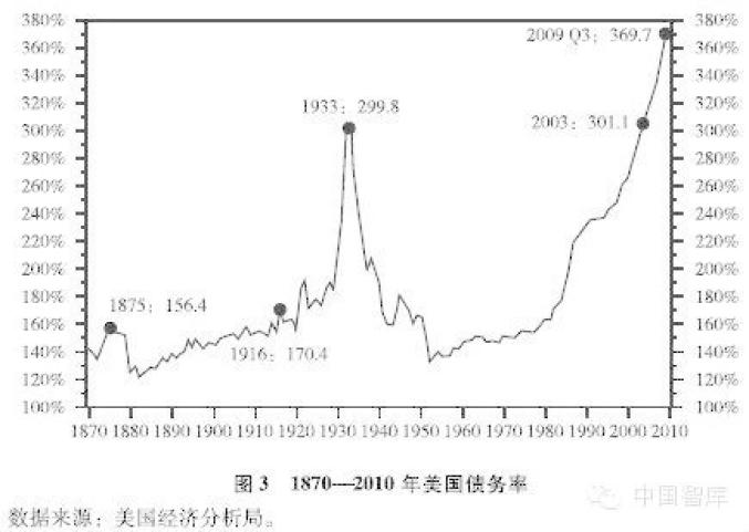 文章认为,每隔70年左右的一次高负债都伴随着一次经济危机(见图3),在这期间工资增长都超过劳动生产率的增长,负债增长都大大超过税收能力。(①在1995年美国住房与城市发展部发布的《国家住房战略》中,克林顿提出:“要实现住房自有率在本世纪末达到历史最高水平”。2004年10月小布什在华盛顿竞选连任的演讲时提出:“任何一个家庭搬进自己拥有的房子都会感到美国比其他国家强”。)