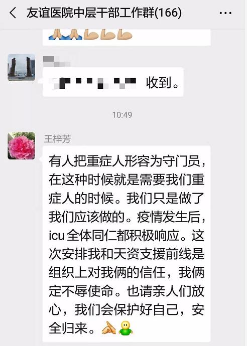 “2020年2月2日必将是我终身难忘的日子。那一天带着父母、亲朋好友的殷殷期盼和祝福,奔赴全国抗疫第一线武汉。我不知道这段经历会对我的人生有什么影响,但是我明确一点,我成长了。”王梓芳说,想起支援初衷,特别简单、纯粹。本次支援需要重症专业,她恰好符合;作为护士长、党员,她更应以身作则,身先士卒;作为大姐,与其让小伙伴去前线,不如让经验比较丰富的她先去探探路……