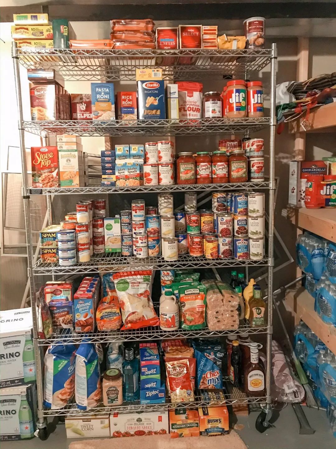 一位来自美国的主妇Tina就在社交平台了展示了她疫情期间的“余粮”,在地下室里堆起了满满一货架的罐头。