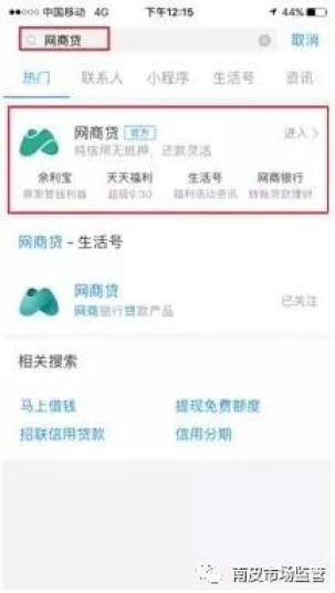 【第一步】下载并安装支付宝,打开支付宝搜索“网商贷”,选择第一个搜索结果。