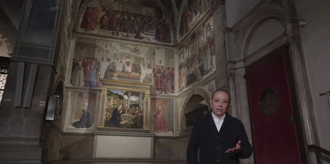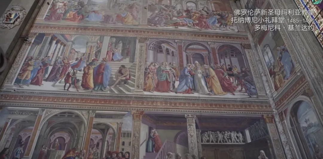 佛罗伦萨火车站对过的新圣母玛利亚大教堂,矗立着基兰达约最宏大的壁画,大于弗朗切斯卡的《真十字架传奇》。这些画的总标题是《圣玛利亚生平》,包含《圣约雅敬被逐出圣殿》《圣玛利亚的诞生》《玛利亚在圣殿中》《圣母的婚礼》《三博士朝圣》《无辜者的屠杀》《圣母之死和升天》七幅大画。