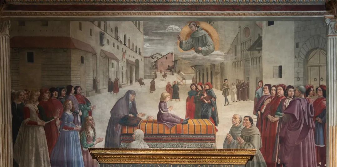他家族的主保圣人是著名的圣方济各,所以家族后人捐了这座礼拜堂,请基兰达约绘制圣方济各的传说。他巧妙地利用传说满足萨塞蒂,又利用萨塞蒂家的故事,画他对人脸的观察。