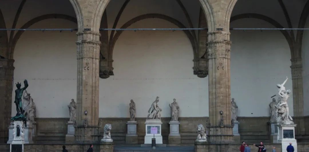 今天的领主广场挤满了游客。在基兰达约的时代,佣兵廊空着,尚未安放16、17世纪的雕刻。