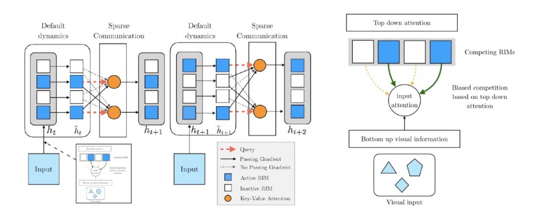 RIM 架构的一个步骤分为四个阶段(图 1 中的左图显示了两个步骤)。在第一阶段中,各个 RIM 生成一个用于从当前输入读取的查询 query。在第二阶段,使用基于注意力的竞争机制,根据编码的视觉输入选择要激活的 RIM(右图)(基于注意力得分,蓝色 RIM 处于活动状态,白色 RIM 保持非活动状态)。在第三阶段,单个激活 RIM 按照默认转换动态运行,而非激活 RIM 保持不变。在第四阶段,使用注意力机制在 RIMs 之间进行稀疏通信。