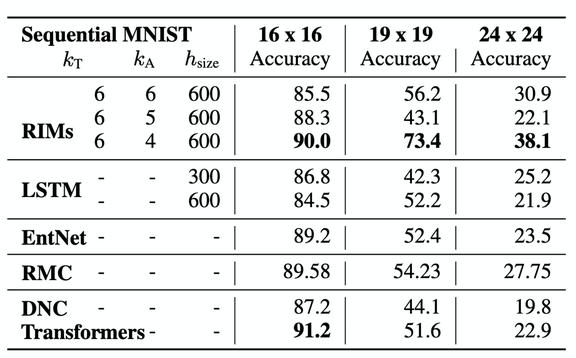 RIM 的考虑是假设可以通过只在序列的相关部分激活模块来提高泛化性能,为了证明这一考虑的正确性,作者给出了将 MNIST 数字分类为像素序列的实验,并针对不同分辨率的测试图像进行了推广,以证明 RIM 的泛化能力。表 1 给出了 RIM 完成序列 MNIST 分辨率任务的结果,表中数值为 3 次不同的实验结果的平均值。如果验证序列长度和测试序列长度一致,则两个模型(RIM、LSTM)都显示出较好的性能。然而,随着序列长度的改变(通过改变图像分辨率)RIM 的表现相对稳定,而 LSTM 的性能下降的较为严重。此外,RIM 的性能优于其它基线模型,如 Transformers、EntNet、RMC 以及微分神经计算机(DNC)等。