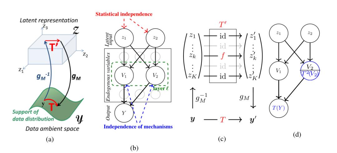 这篇文章提出了一个因果生成模型(A Causal Generative Model,CGM)框架。如图 2b 所示, 本质也是一个因果图模型,其基本假设前提仍然是因果原理的独立机制,即促成生成过程的因果机制相互之间无影响。因此,可以通过单独修改某些生成机制来研究直接干预神经网络模型的效果。具体到生成模型中,因果关系允许分析如果某些变量采用不同的值(称为「反事实值」,counterfactual),结果会如何改变,进而评估生成模型捕获因果机制的能力。CGM 框架如图 3 所示,其中,(a)给出 生成映射和分离变换的图示,(b)为显示节点之间不同类型独立性的示例 CGM 的因果图,(c)为显示与分离变换 t 相关的潜在空间中的稀疏变换 t′的交换图,(d)为内在分离的图示。