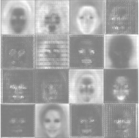 图 5 给出了一个在 CelebA 数据库上训练得到的 VAE 卷积层通道的表示 EIMs 示例,以及,图中通道实现了功能性的分级,例如一些影响更精细的面部特征(眼睛、嘴,…)和其他影响图像的背景或头发等等。这就说明,单个通道可以聚合形成模块,而这些模块对应于输出(人脸图像)的一个特定特征。