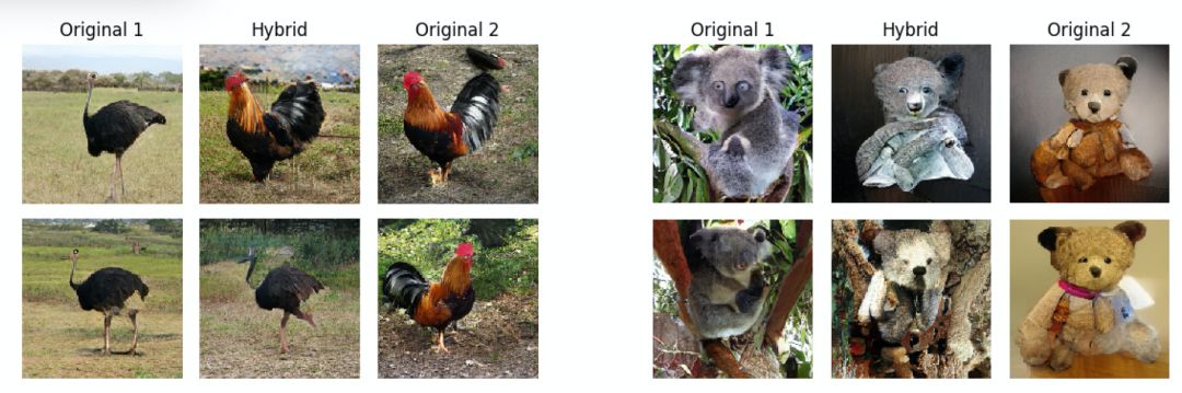 为了验证这篇文章所提出的方法是否可以扩展到高分辨率的生成模型,并推广到包含各种对象的复杂图像数据集,作者使用了 BigGAN-deep 框架进行实验 [5],同时利用 ImageNet 库进行预训练 (https://tfhub.dev/deepmind/biggan-deep-256/1)。BigGAN 是一个条件 GAN 架构,由 12 个 Gblocks 组成,每个 Gblock 包含 4 个卷积层的级联。每个 Gblock 还接收来自潜在变量和类别标签的直接输入,并由跳过连接绕过。这篇文章中作者使用 BigGan 验证是否能够通过混合不同类别的特征来产生混合体。图 6(公鸡鸵鸟)中提供的示例表明,在前景中保持非常相似的对象的同时,可以使用修改的背景生成高质量的反事实。在更具挑战性的情况下,对于不同性质的物体(图 4 的考拉泰迪),仍然能够生成每个原始样本的有意义的组合:例如,树上的泰迪熊(下一行)或「泰迪考拉」将泰迪纹理与考拉的颜色合并在一个统一的室内背景和一个木质结构中(上一行)。