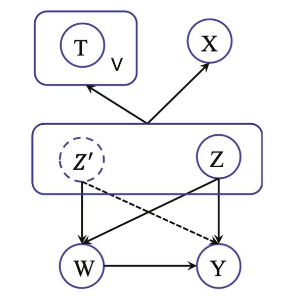 令 Z 和 Z'分别表示观察到的文本协变量 T 和非文本协变量 X 的潜在表示。在潜在表示中,Z'更接近工具变量,因此比结果 Y 更能预测治疗分配。任务目标是学习潜在的表征,过滤掉与仪器变量相关的信息。CTAM 的因果图表示为: