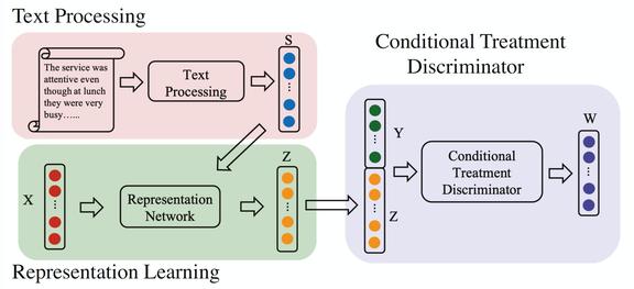 CTAM 包含三个主要部分:文本处理、表示学习和条件处理鉴别器。通过文本处理组件,将原始文本转化为矢量化的表示 S,将 S 与非文本协变量 X 连接起来,构造一个统一的特征向量 C,然后将其输入到表示神经网络中,得到潜在表示 Z。在学习了表示之后,Z 和潜在结果 Y 一起被输入到条件治疗鉴别器中。在训练过程中,表示学习与条件治疗鉴别器进行极大极小博弈:通过阻止鉴别器进行正确的治疗,使表征学习过滤掉与结构变量相关的信息。