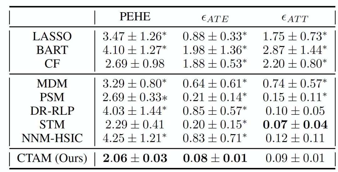 由表 2,CTAM 在 PEHE 和 E_ATE 指标下具有最好的性能,在 E_ATT 指标下性能与最佳基线方法 STM 相比类似。这一结果表明,条件治疗鉴别器能有效地滤除与近似工具变量有关的信息,从而减少治疗效果估计的偏差。