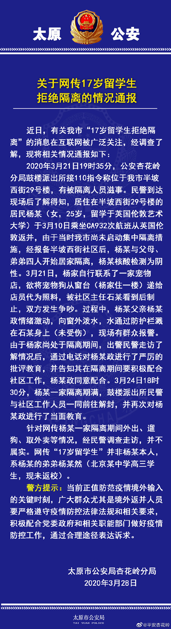 3月28日,太原市公安局杏花岭区分局在其官方微博发布“关于网传17留学生拒绝隔离的情况通报”,以下为通报全文: