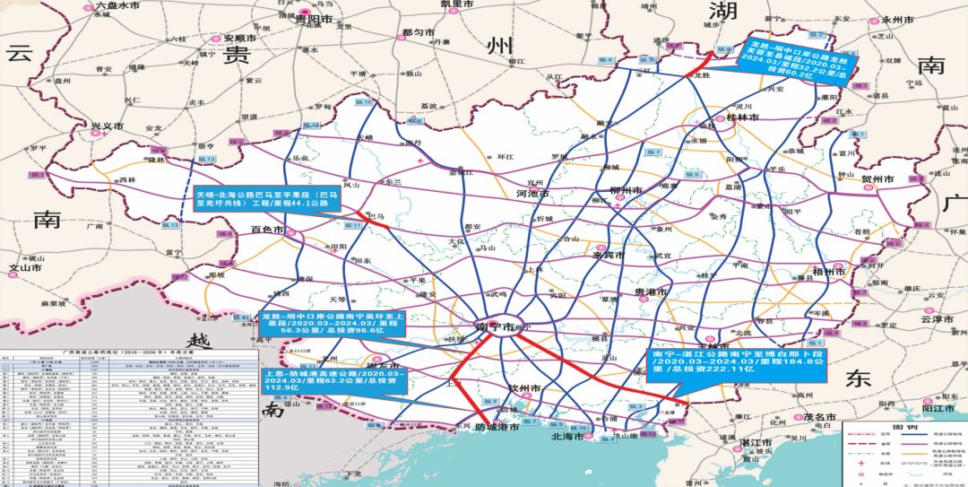 南宁-湛江公路南宁至博白那卜段是《广西高速公路网规划(2018-2030年)》“1环12横13纵25联”中的“联13”。项目起点位于南宁市邕宁区蒲庙镇,终点位于那卜镇东南与广东省交界处。全长约187公里,采用四车道高速公路建设标准,设计速度120公里/小时,路基宽度26.5米,设互通式立交16处,服务区4处,停车区4处。计划建设工期4年。项目建成后,将形成广西南宁直达广东湛江的最为便捷的高速通道,对促进广西壮族自治区与粤港澳大湾区之间的交通联系具有十分重要的战略意义。