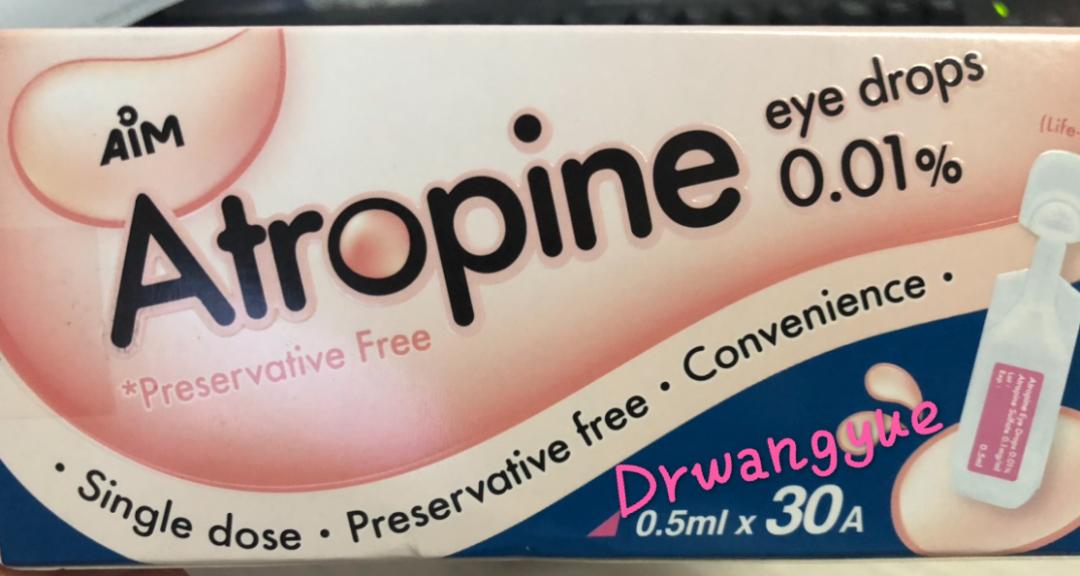 4.有一种可以在一定程度上预防近视发展的眼药水,0.01%的阿托品眼药水,每天晚上睡前点。国内没有,我的患者家长向我展示了一下她们在新加坡买的眼药水的外包装,据说美国也有。这种眼药水可以和角膜塑形镜联合使用,预防近视发展(角膜塑形镜适合8~12岁以上儿童,近视在500~600度以下的患者,有一定控制预防近视发展的作用)。