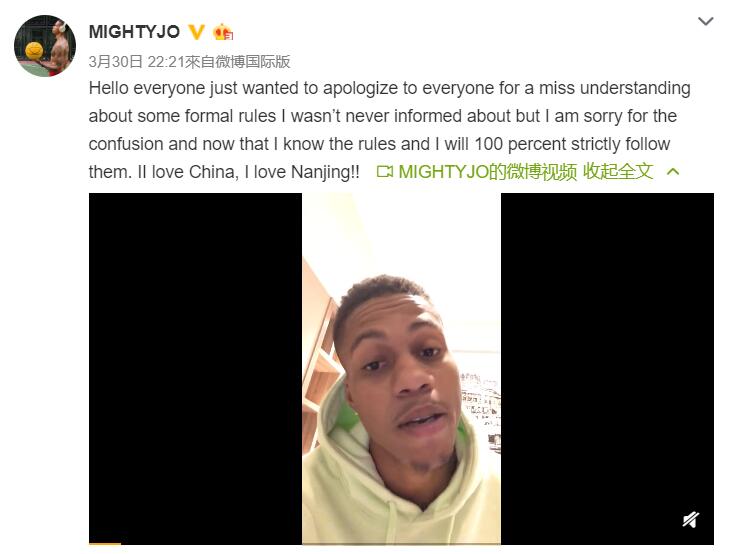 当晚,约瑟夫·杨也为自己的无理行为在微博上道歉,“大家好,我只是想向大家道歉,因为我没有理解一些正式规则,即使我之前从未被告知过。但我很抱歉造成如今的窘况,现在我知道了规则,我将百分之百地严格遵守它们。我爱中国,我爱南京!”