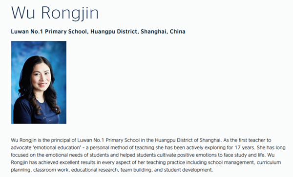 上海市黄浦区卢湾一中心小学的吴蓉瑾从全球数万名候选人中脱颖而出,成为2020年唯一上榜的中国教师,也是该奖项成立以来入选的第一位上海教师。