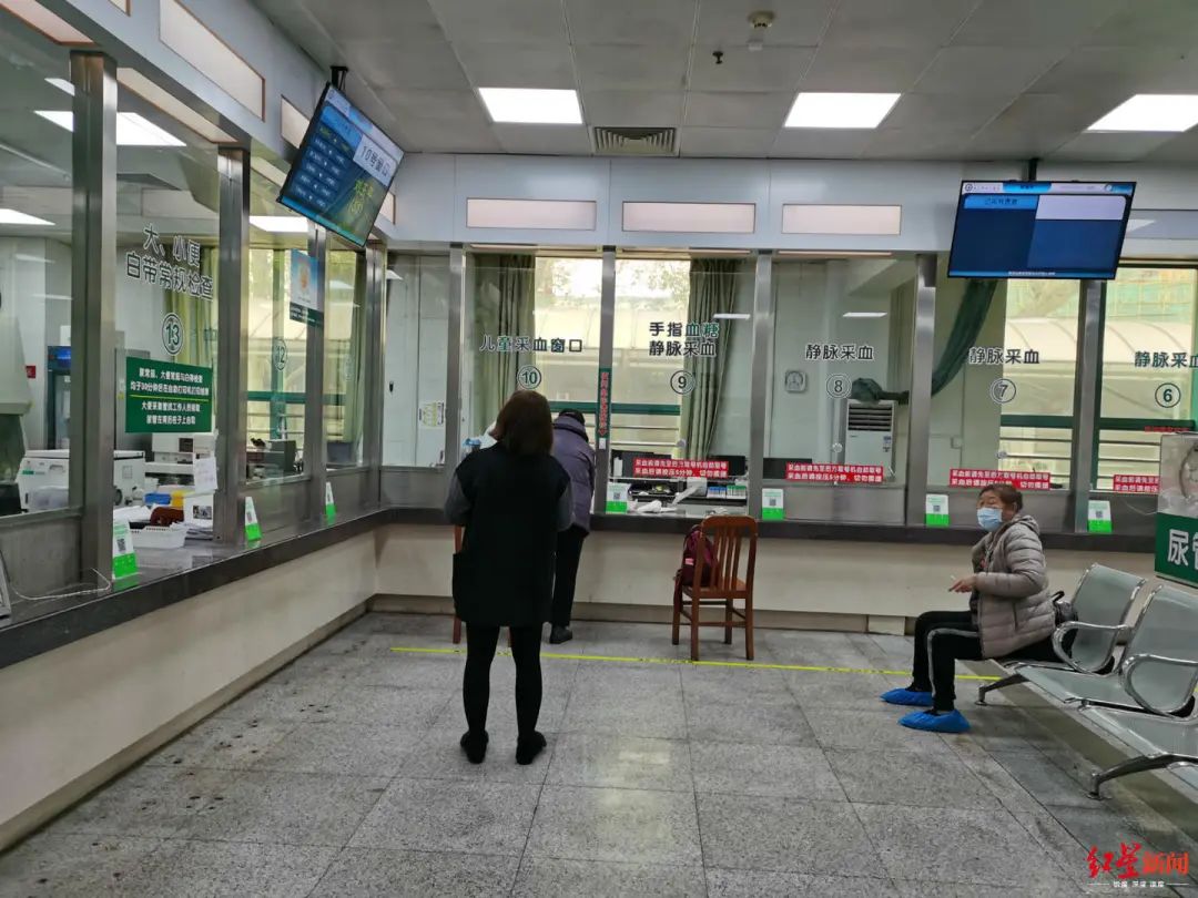 3月28日,南京路院区门诊大门已经开放,市民消毒、测量体温后可以进入。红星新闻记者在现场看到,前来就诊的人不多,医院内,部分窗口仍然关闭。一楼采血区只开着两个窗口,有三位病人在排队采血,医护人员全部穿着防护服。中心医院一位医生告诉记者,目前就诊的病人都会先进行一次筛查,没有新冠肺炎才会正常治疗。