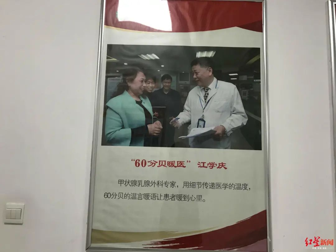 医院走廊里贴着2019年优秀医护人员的照片。记者发现,3月1日因感染新冠肺炎离世的甲状腺乳腺外科主任江学庆的照片也在其中。照片中,“60分贝暖医”江学庆侧身,微笑着和病人交流,下面配文:甲状腺乳腺外科专家,用细节传递医学的温度,60分贝的温言暖语让患者暖到心里。