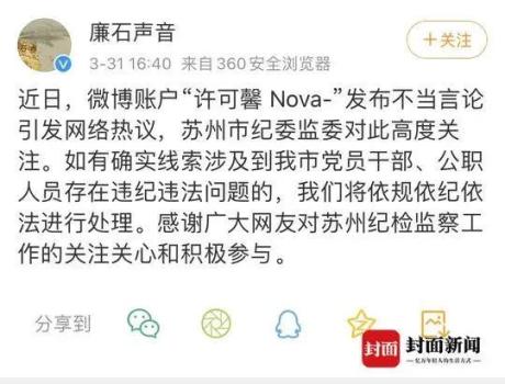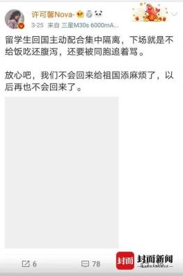 近日,中国留学生许可馨通过其新浪微博账号@许可馨Nova- 发布大量关于疫情的不恰当言论引发公众关注。有网友称其父母为苏州市党员干部、公职人员。