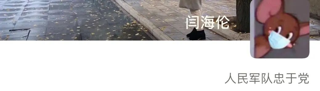 点开闫海伦的朋友圈,签名那一栏挂着“人民军队忠于党”。