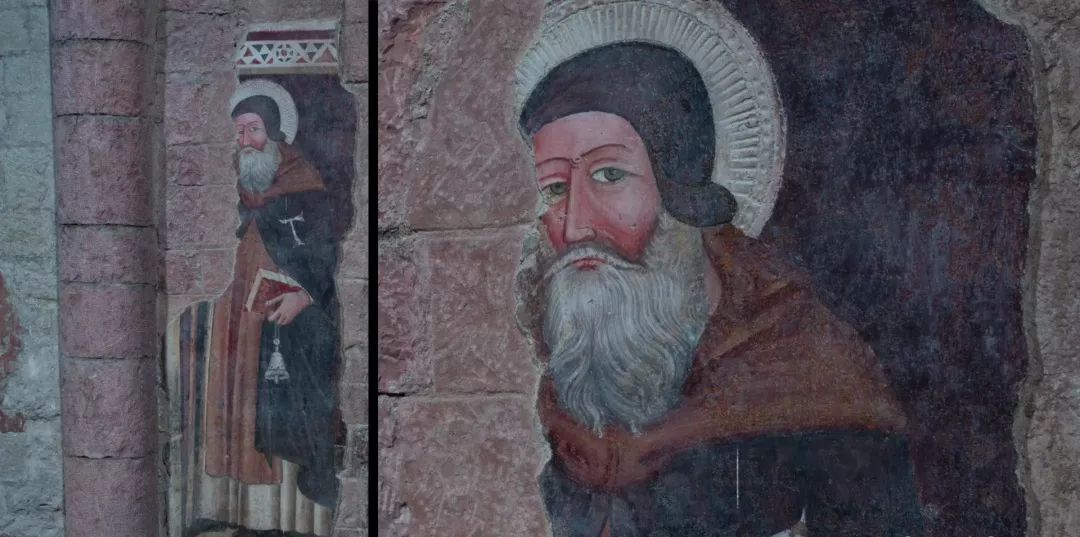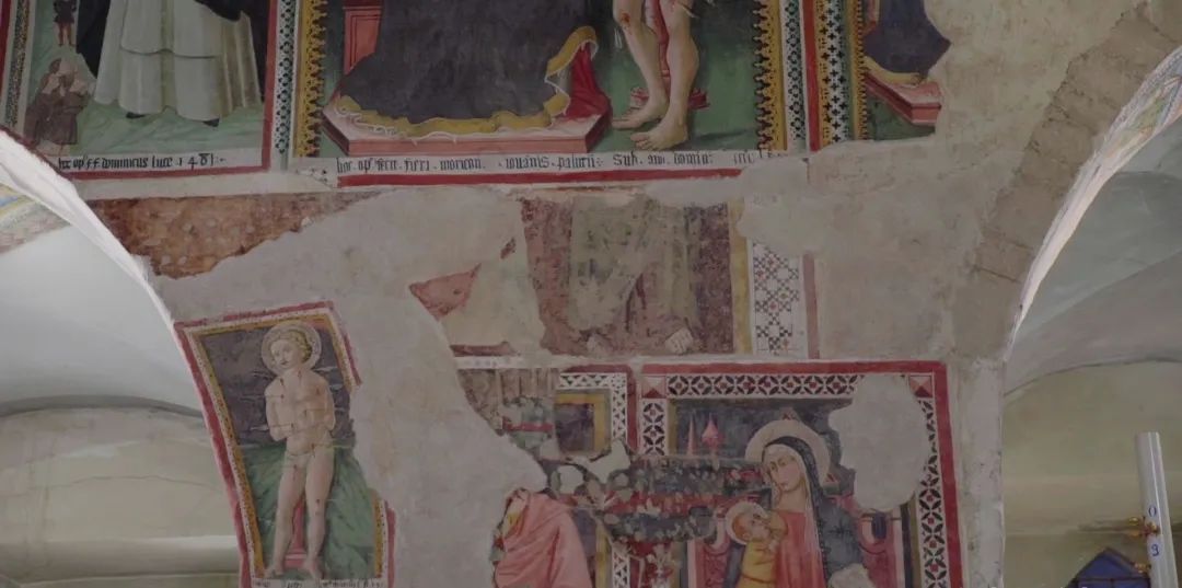 大家看,墙上布满历年增添的壁画有如补丁打补丁,年代从十三世纪到十六世纪。单单是浑身插满利箭的圣塞巴斯蒂安图像,居然有七幅之多。