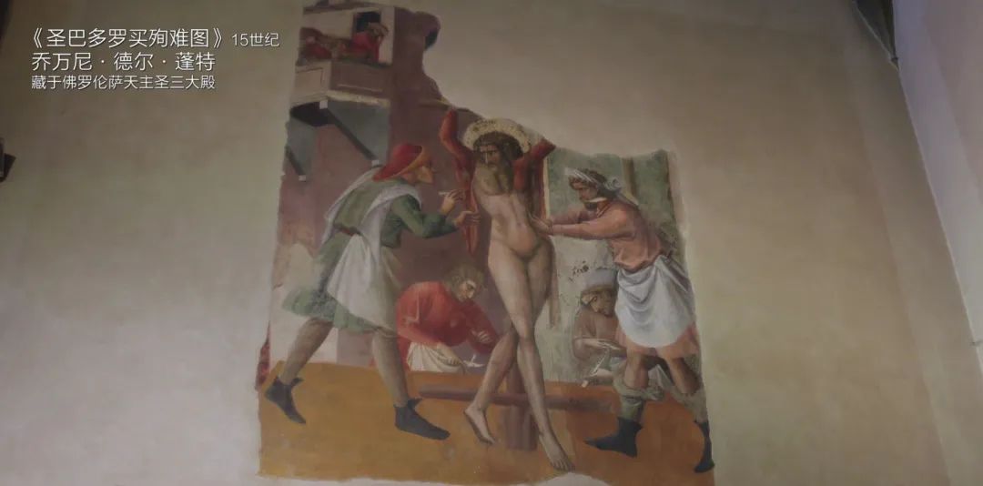 记得那位复活的黄毛小儿吗?从基兰达约画的礼拜堂转过身,走几步,墙面上就是这幅孤零零的受难图。
