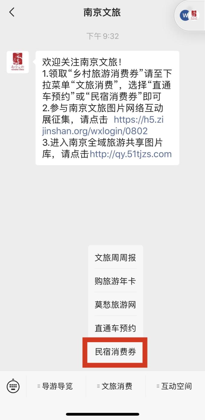 1.关注“南京文旅”微信公众号,点击“文旅消费”子菜单选择“民宿消费券”。