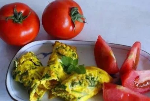 做法:摘新鲜艾草,切碎;打入两个鸡蛋,拌均匀;平底锅煎;卷成蛋卷,切断装饰。