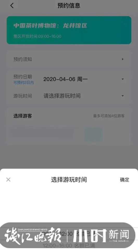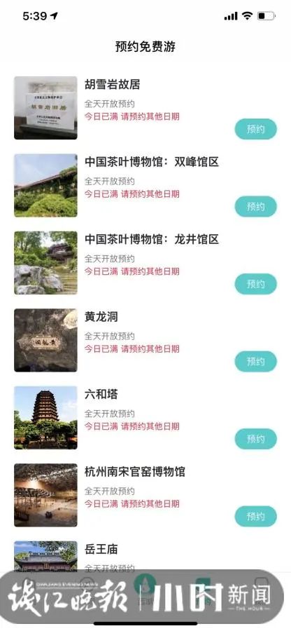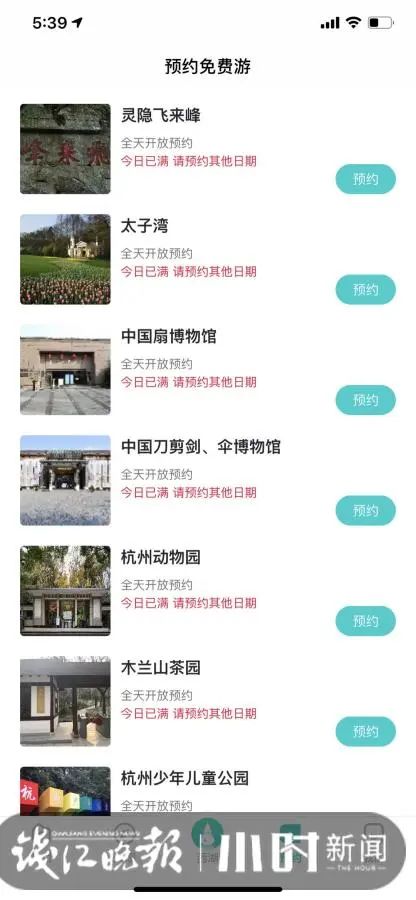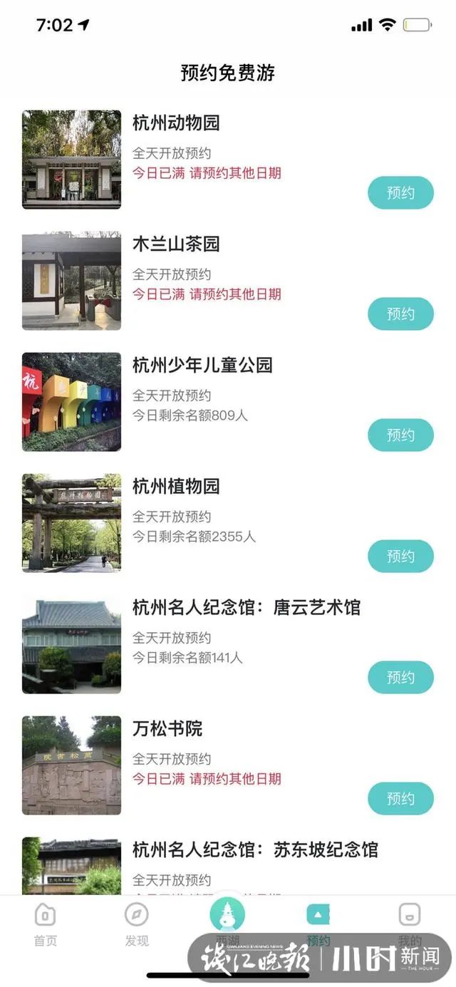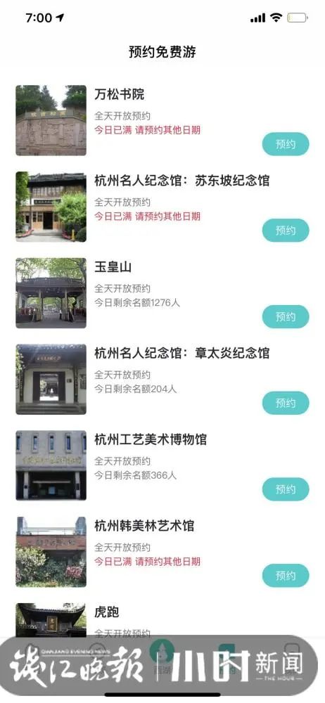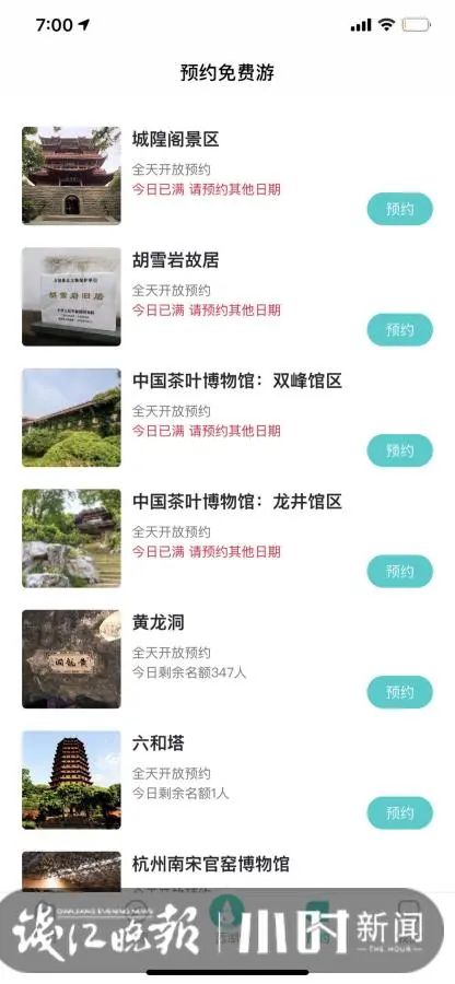 昨天早上7点,小时新闻记者点入“掌上西湖”APP,发现杭州动物园、城隍阁景区、胡雪岩故居、杭州名人纪念馆(苏东坡纪念馆)、万松书院、中国茶叶博物馆的双峰馆区和龙井馆区、木兰山茶园、杭州韩美林艺术馆等公园和景点,都约满了。