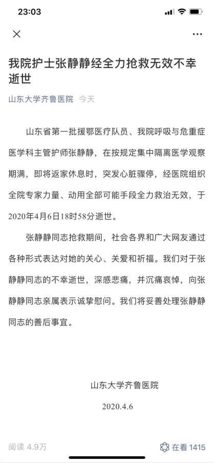 山东省第一批援鄂医疗队员、我院呼吸与危重症医学科主管护师张静静,在按规定集中隔离医学观察期满,即将返家休息时,突发心脏骤停,经医院组织全院专家力量、动用全部可能手段全力救治无效,于2020年4月6日18时58分逝世。
