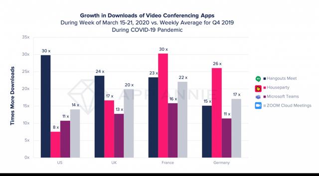 研究机构Apptopia披露的数据显示,由于新冠肺炎疫情促使大量美国人在家办公或上课,Zoom在整个2020年3月的活跃用户数较2019年同期增长了151%,用户数是其竞争对手微软Teams的近三倍。