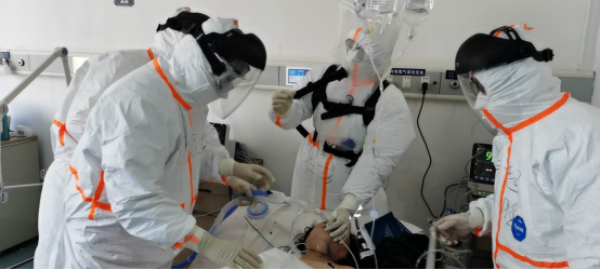 由于隔离病房不具备负压系统,气管插管中打开呼吸道的瞬间,大量的病毒就会喷涌而出,对实施操作的医生感染风险极大。“人民医院对我们很照顾,给我们进来一套正压头盔,这是个关键利器!”丁仁彧由衷感谢。“正压头盔”,学名医用正压送风隔离式防护服,用于高级别实验室的生化防护以及病毒污染区域、核气溶胶污染区域的紧急救护。丁仁彧穿戴完毕,不放心穿着普通防护服的兄弟尹超,又快速给他检查了一下密闭性,没问题后,丁仁彧化身“暖心大白”,带着战友走入隔离区。待静脉给药起效,迅速准确将导管送入气道,吸引分泌物,连接有创呼吸机。行云流水完成一系列操作后,丁仁彧轻松一些,“最危险的操作完成了,没有呛咳,主要担心我这帮兄弟。”之后是继续忙碌,调整呼吸机参数、调整各项血流动力学指标、穿刺置管、泵注镇静药等,待患者病情终于平稳,已是几个小时之后,团队终于走出隔离病房,脱下防护装备,每个人都湿淋淋的。