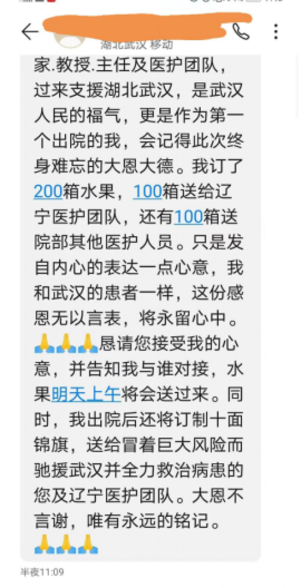 昨夜将近子时,丁仁彧收到了一条感谢信,来自他治疗的第一个出院的危重症病人。信中是病人对丁仁彧团队和辽宁医疗队的医护人员发自肺腑的感谢,并订了100箱水果送给他们。丁仁彧说因为身份特殊,避免交叉感染的可能性,没能和自己第一个出院的患者留个合影,也很遗憾,甚至她都不知道我们长什么样,不过没关系,我们都有一个共同的名字——辽宁重症医疗队。他还补充说,坚决不提倡送东西,我们的生活物资已经很丰富了。