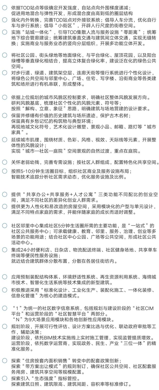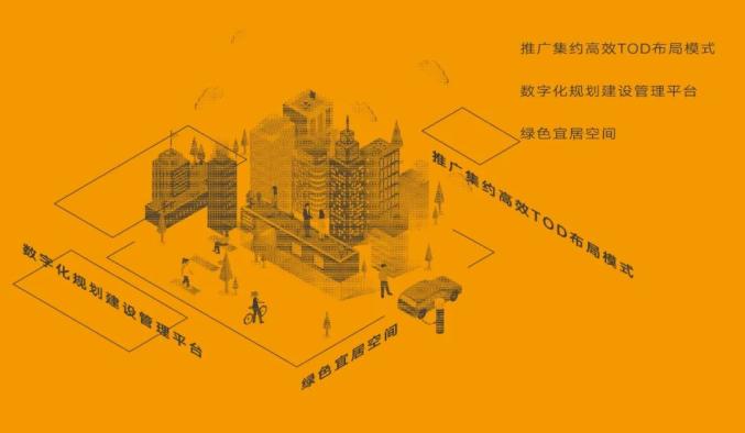 推广集约高效公共交通导向开发(TOD)布局模式,围绕公交枢纽和轨道交通站点,形成大疏大密布局模式,探索容积率弹性管理机制,推动地上地下空间高强度复合开发,统筹做好地下综合管廊建设衔接。打造绿色宜居宜业空间,促进空间集约利用和功能集成,探索弹性功能组合空间模式,优化青年创业公寓、新型养老公寓等配比,推广智慧家居系统应用。建设个性化、泛在化绿色公共空间,依托阳台绿槽、社区公园、屋顶花园等,提高立体复合绿化率,完善配备服务设施,打造艺术与风貌交融未来建筑场景。搭建数字化规划建设管理平台,构建社区信息模型(CIM) 平台,实现规划、设计、建设全流程数字化,建立数字社区基底。应用推广装配式建筑、室内装修工业化集成技术。