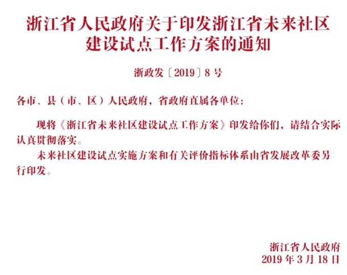 浙江省根据大湾区大花园大通道大都市区建设行动计划要求,就开展未来社区建设试点工作制定《浙江省未来社区建设试点工作方案》(浙政发〔2019〕8号)(以下简称《试点方案》),《试点方案》明确了未来社区建设试点目标定位、任务要求、措施保障,为下一步全面开展未来社区建设试点指明了方向。