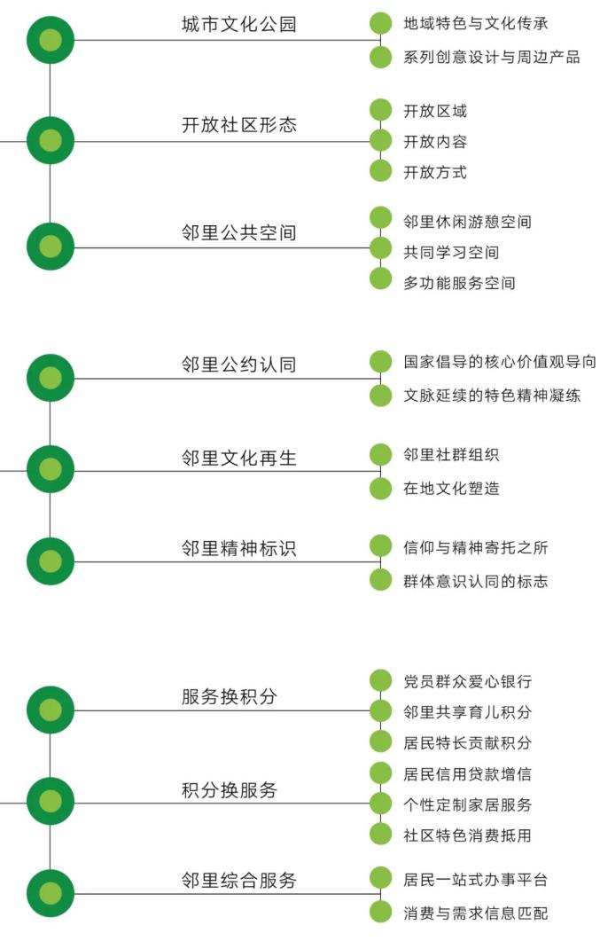 营造特色邻里文化,突出社区即城市文化公园的定位,以城市乡愁记忆和社区历史文脉为基础,以和合文化为引领,坚持人文多样性、包容性和差异性,营造承载民俗节庆、文艺表演、亲子互动等活动的邻里交往空间。构建邻里贡献积分机制,弘扬诚信守约、共享互助、公益环保社区精神,建立信用评价体系,构建服务换积分、积分换服务激励机制。打造邻里互助生活共同体,制定邻里公约,建立邻里社群,发挥居家办公人员、自由职业者、志愿者及退休专业人员等群体的特长优势,为居民提供放心安全的服务,形成远亲不如近邻的邻里氛围。