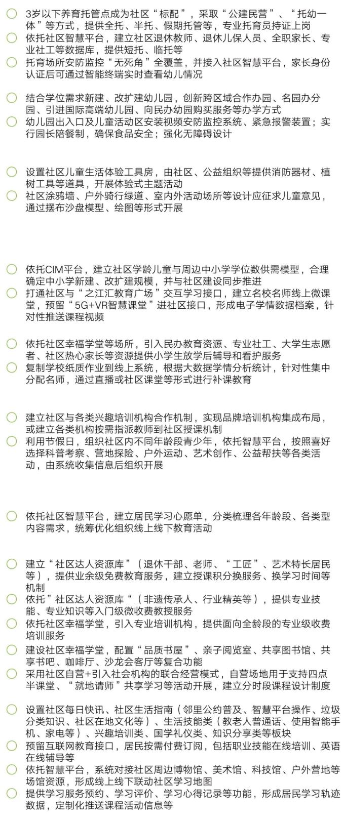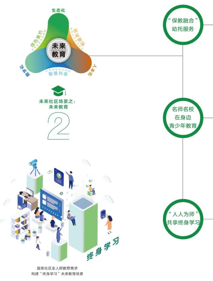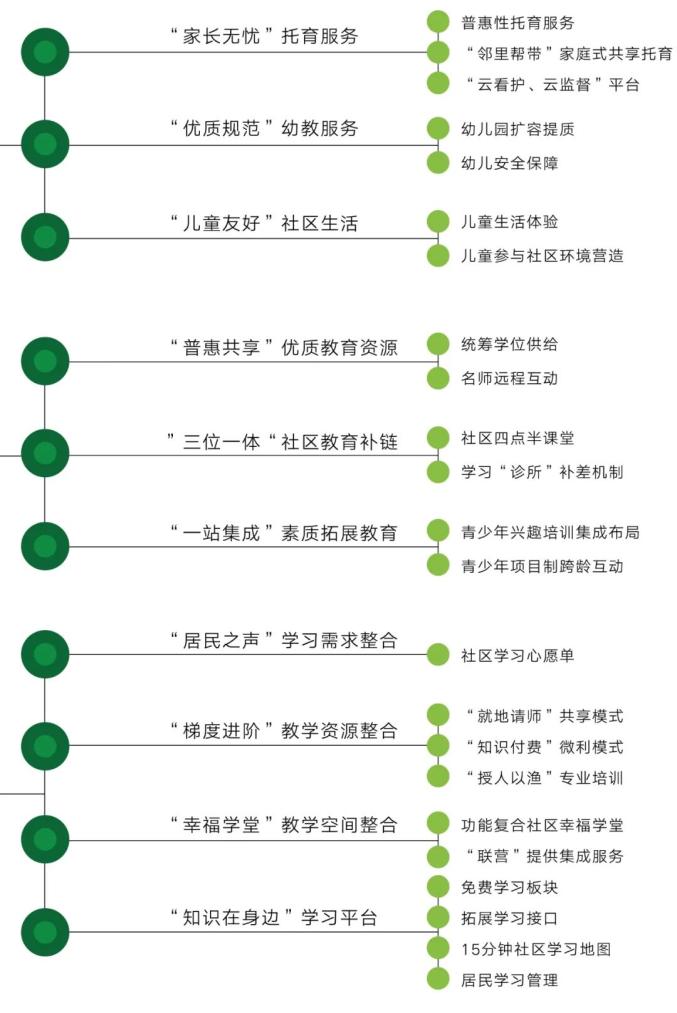 高质量配置托儿服务设施,重点发展普惠性公办托育机构,探索临时看护、家庭式托育等多元化模式,强化专业托育员培训和监管体系建设,实现3岁以下幼儿托育全覆盖。提升扩容幼小服务设施,扩大优质教育资源供给。打造“名师名校在身边”青少年教育平台,围绕3-15岁年龄段教育需求,打造社区青少年线上线下联动的学习交流平台,打通优质教育资源进社区的渠道,集成素质拓展、兴趣活动等多种类型教育服务。搭建“人人为师”共享学习平台,建设社区邻里共享学堂、共享图书馆等,探索建立社区全民互动的知识技能共享交流机制,丰富教育培训内涵,倡导终身学习新风尚。