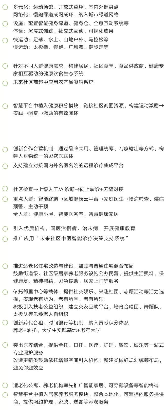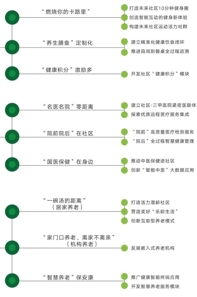 促进基本健康服务全覆盖,围绕实现全民康养目标,建立全生命周期健康电子档案系统,完善家庭医生签约服务机制。推广可穿戴设备等智能终端应用,探索社区健康管理线上到线下(O2O)模式,促进健康大数据互联共享。创新社区健身服务模式,科学配置智能健身绿道、共享健身仓、虛拟健身设备等运动设施。加强社区保健管理,普及营养膳食、保健理疗等养生知识。促进居家养老助残服务全覆盖,创新多元化适老住宅、居家养老服务中心、日间照料中心、嵌入式养老机构、老年之家等场所配置,支持“互联网+护理服务”等模式应用。构建名医名院零距离服务机制,探索城市医院与社区医院。合作合营,通过远程诊疗、人工智能(AI)诊断等方式,促进优质医疗资源普惠共享。