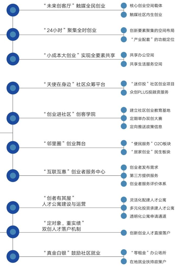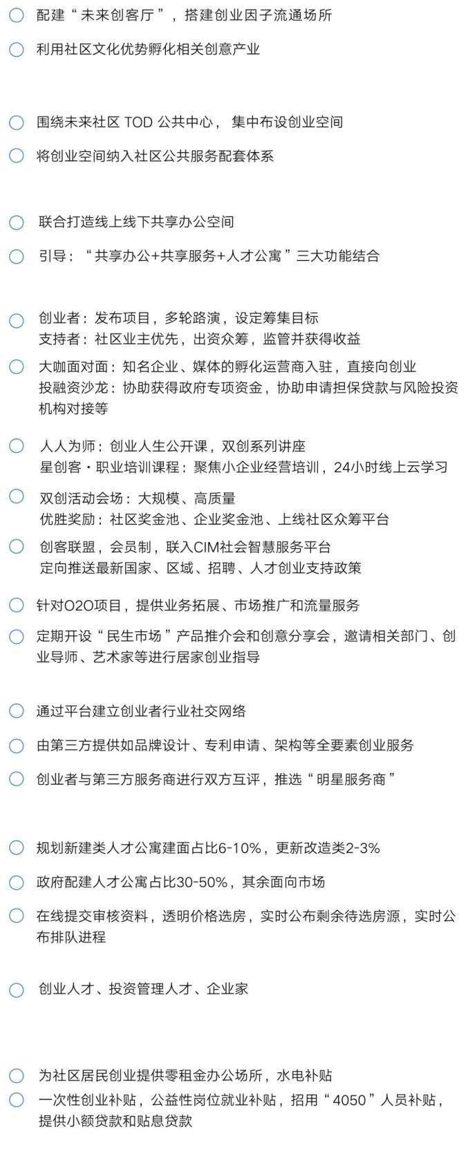 搭建社区“双创”空间,结合地方主导产业培育,按照数字经济、文化创意等领域特色创业需求,配置孵化用房、共享办公、家居办公(SOHO)等“双创”空间,配套共享厨房、共享餐厅、共享书吧、共享健身房等生活空间,营造社区创新创业良好生态。激发共享经济潜能,依托社区智慧平台,形成共享服务需求与供给零距离对接场景,促进社区资源、技能、知识等全面共享。健全特色人才落户机制,推出多类型人才公寓,采用定对象、限价格等方式,建立利于招才引智的出售出租政策机制,吸引更多特色人才安家落户,打造各类特色人才社区。