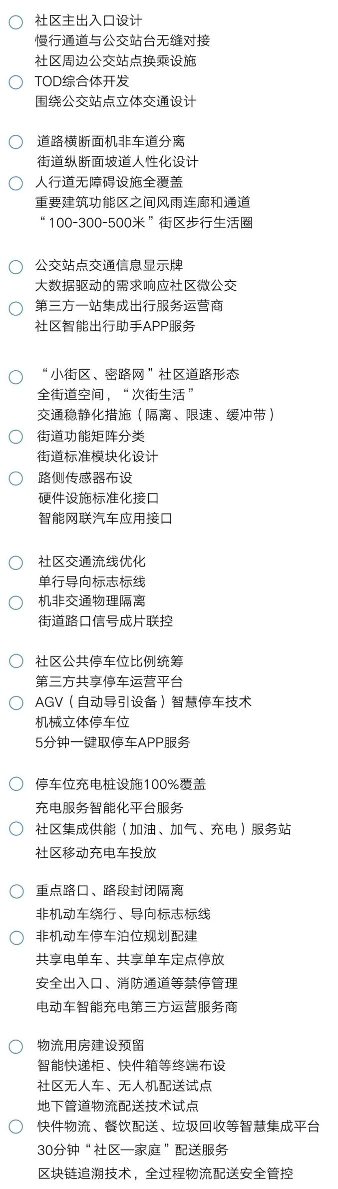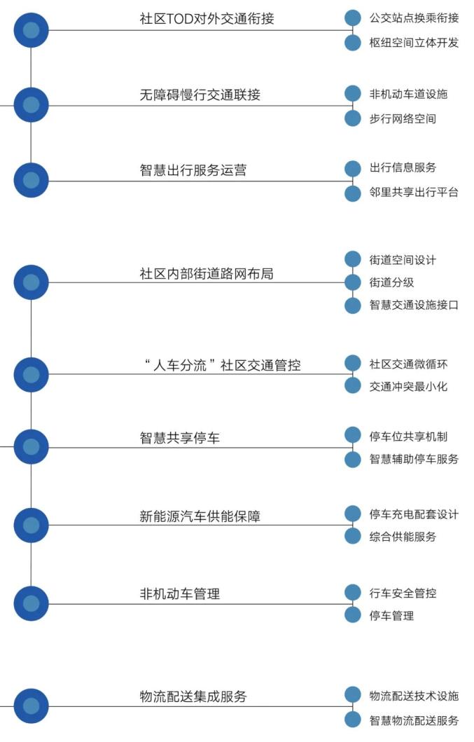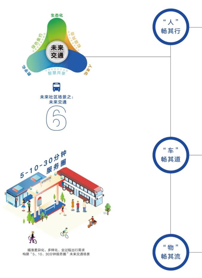 突出差异化、多样化、全过程,构建“5、10、30分钟出行圈”。以车实现5分钟取停为目标,统筹车位资源,创新车位共享停车管理机制,推广应用自动导引设备( AGV )等智能停车技术。完善社区新能源汽车充电设施供给,预留车路协同建设条件,为5G环境自动驾驶和智能交通运行留白空间。以人实现10分钟到达对外交通站点为目标,创新街区道路分级、慢行交通便利化设计,倡导居民低碳出行,通过信息服务实现一键导航、交通无缝衔接,打造居民便捷交通站点出行圈。以物实现30分钟配送入户为目标,运用智慧数据技术,集成社区快递、零售及餐饮配送,打造“社区——家庭 ”智慧物流服务集成系统。