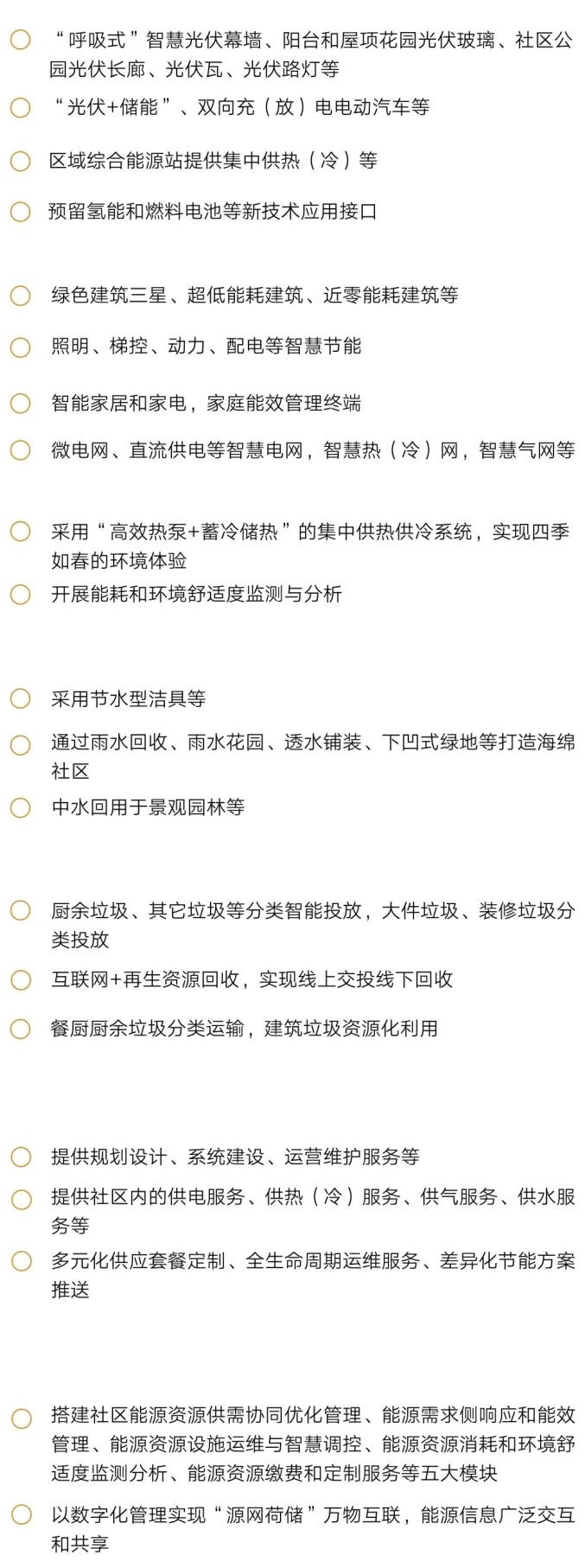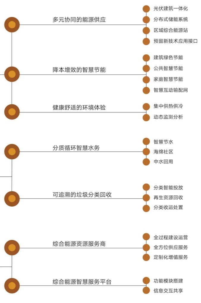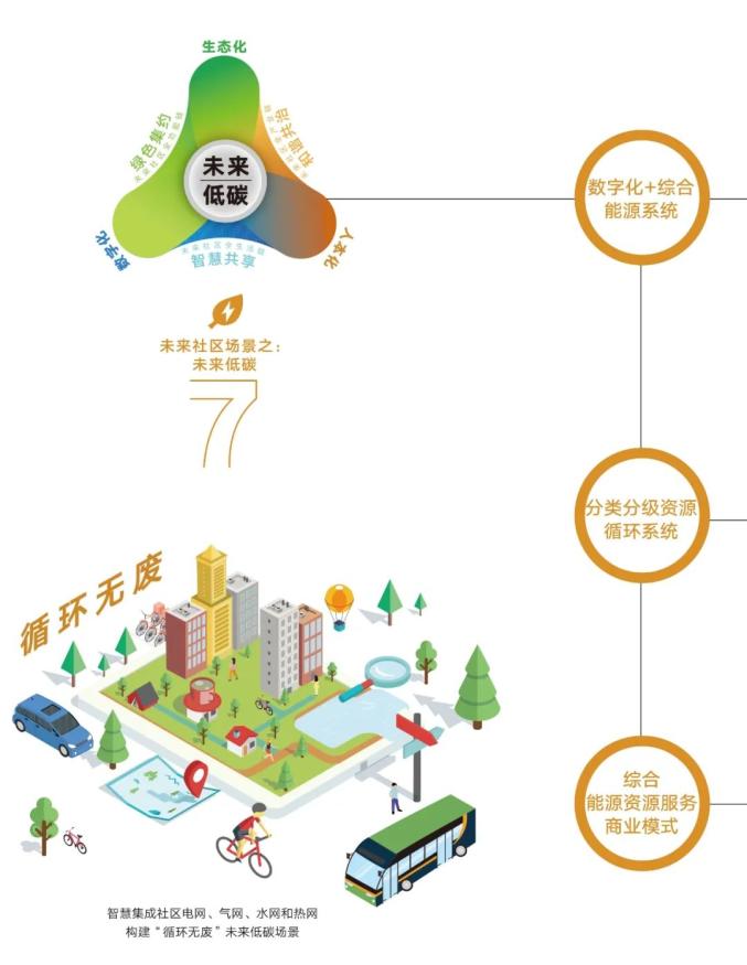 打造多能协同低碳能源体系,构建社区综合能源系统,创新能源互联网、微电网技术利用,推广近零能耗建筑,建设“光伏建筑一体化+储能 ”的供电系统、“热泵+蓄冷储热”的集中供热(冷)系统,优化社区智慧电网、气网、水网和热网布局,实现零碳能源利用比例倍增。构建分类分级资源循环利用系统,打造海绵社区和节水社区,推进雨水和中水资源化利用。完善社区垃圾分类体系,提升垃圾收运系统功能,促进垃圾分类和资源回收体系“两网融合”、建筑垃圾资源化利用,打造花园式无废社区。创新互利共赢模式,引进一体化开发、投资、建设和运营的综合能源服务商,搭建综合能源智慧服务平台,实现投资者、用户和开发商互利共赢,有效降低能源使用成本。